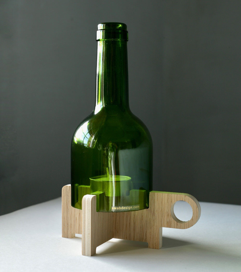 Bougeoir bouteille recyclée "BoBoBo" - Verre vert et bois naturel