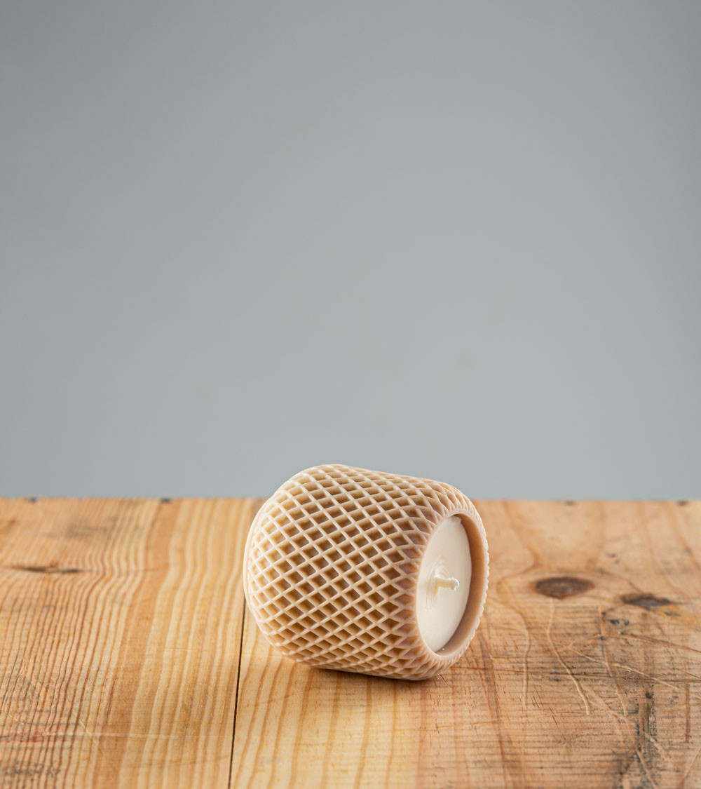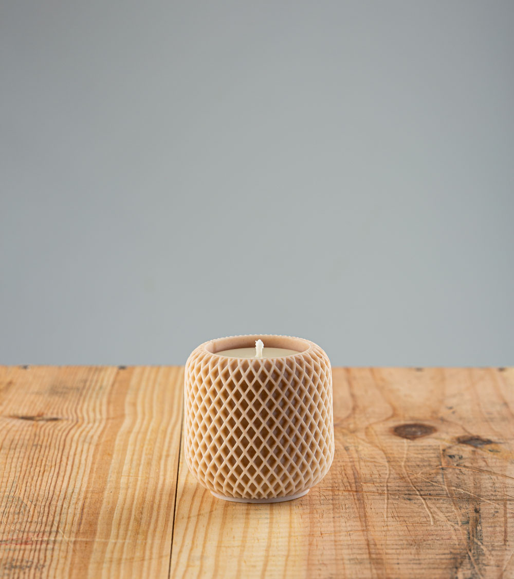 Découvrez "Charmine", un concept unique de bougie-bougeoir design de couleur Beige Châtaignier entièrement en cire avec des colorants à base de plantes tinctoriales cultivées et transformées en France. Cette bougie naturelle est un véritable joyau de l'artisanat français.