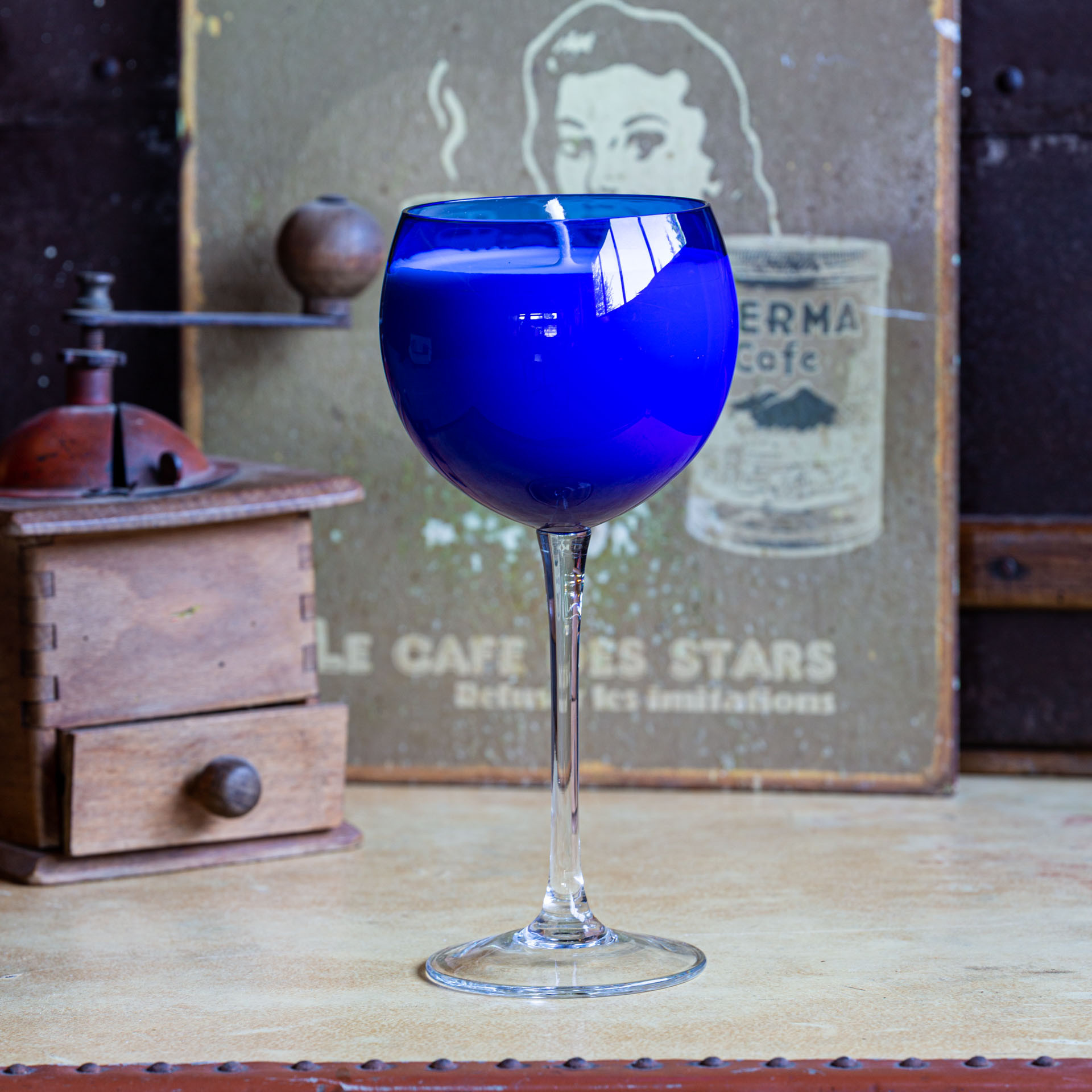 Le verre à cocktail vintage qui accueille la bougie est un objet chiné et réinventé. Après combustion, il peut être nettoyé et réutilisé comme verre ou élément décoratif, prolongeant son utilité et inscrivant votre achat dans une démarche écoresponsable.
