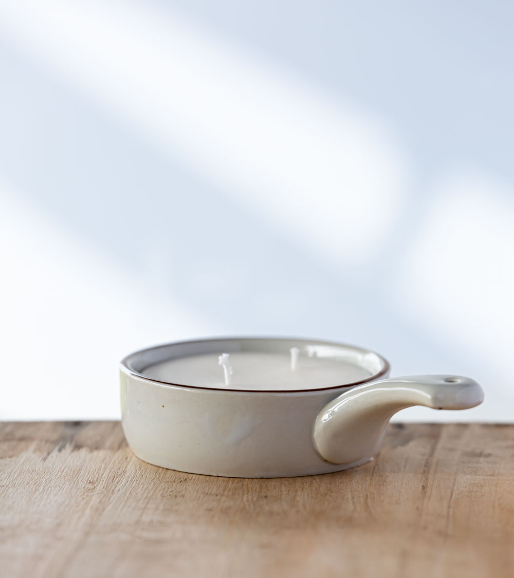 Le contenant choisi pour "Balandine" est un poêlon ancien, chiné puis transformé avec soin. Par sa forme rétro et son esthétique intemporelle, il confère à cette bougie une originalité unique qui attire l’œil. Ce geste d’upcycling illustre la volonté de donner une seconde vie à des objets existants, en les valorisant comme supports d’un nouvel usage, à la fois esthétique et fonctionnel. Une fois la bougie consumée, ce poêlon peut être réutilisé comme objet déco, pot ou récipient, prolongeant ainsi son cycle de vie et renforçant son caractère durable.