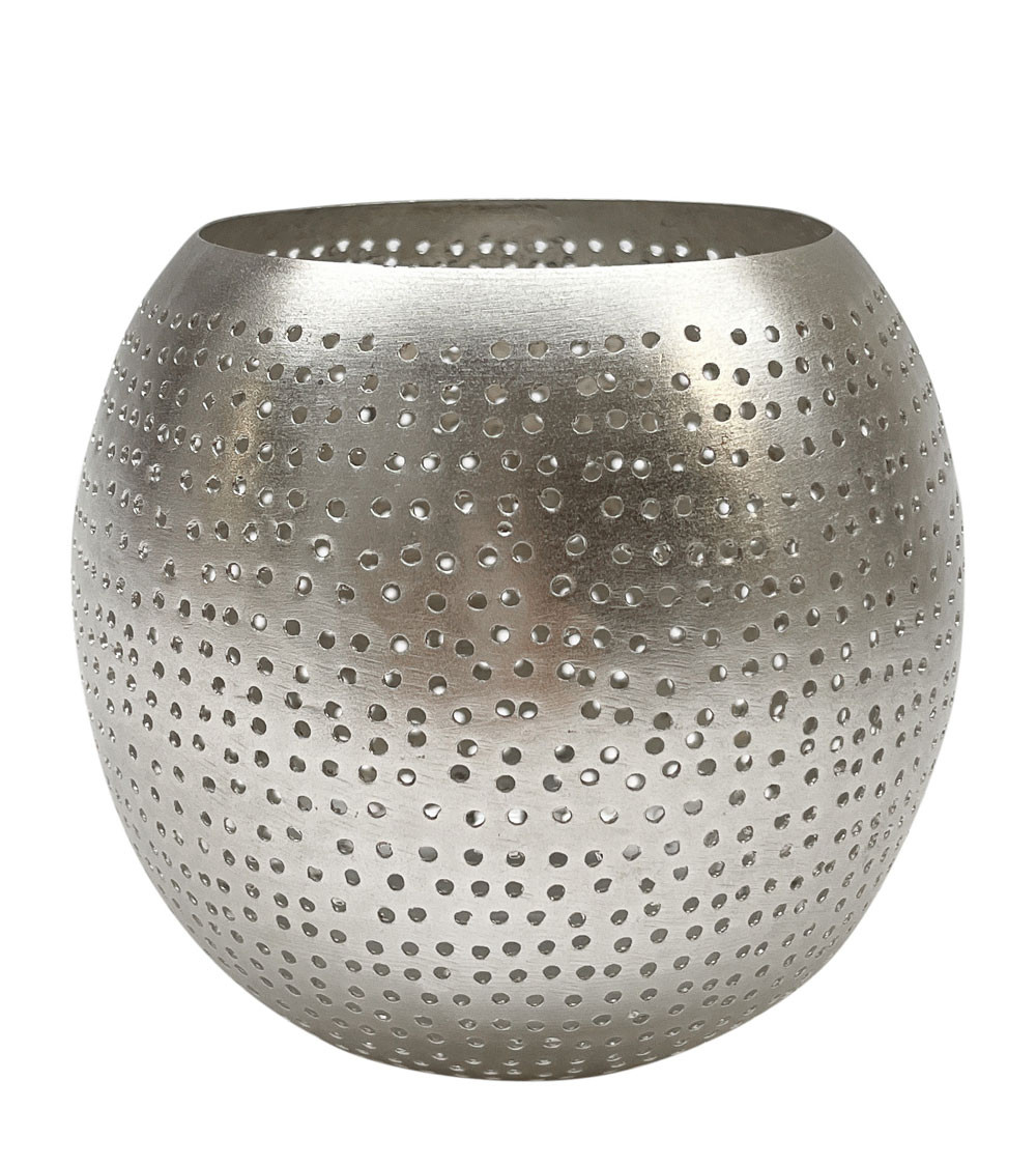Ce photophore en laiton argenté est un bel exemple de décoration artisanale, où la simplicité des formes met en valeur le travail de la matière. Fabriqué en laiton, il se distingue par ses motifs perforés réalisés à la main, rendant chaque pièce légèrement unique.