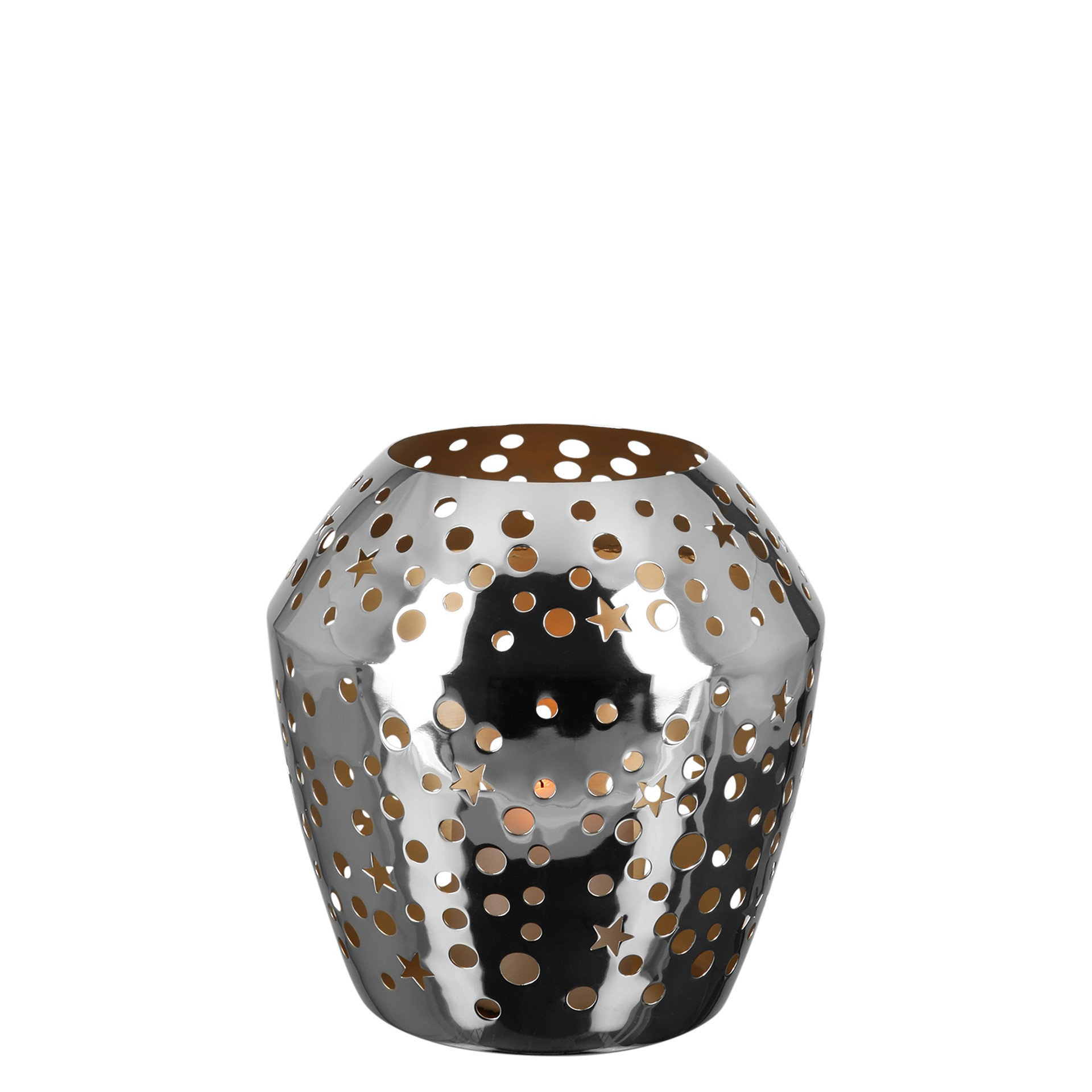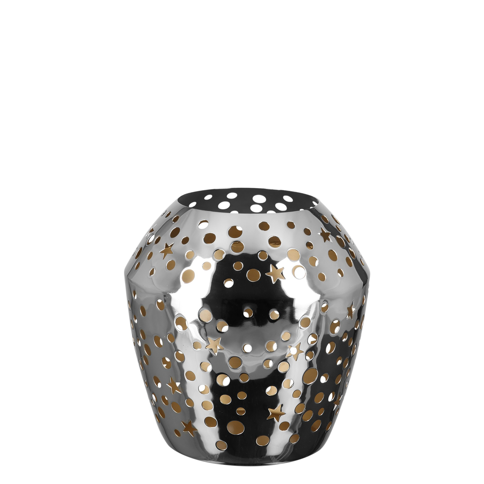Illuminez vos soirées avec le photophore Sheila H 24 cm, une pièce élégante qui allie brillance argentée et chaleur dorée. Fabriqué à la main, ce photophore en métal nickelé séduit par son design ajouré, orné de découpes circulaires et étoilées qui projettent de magnifiques jeux de lumière. Son revêtement intérieur doré reflète la flamme et diffuse une lueur chaleureuse, idéale pour créer une atmosphère cosy et raffinée. Parfait pour vos décorations d’hiver, de Noël ou de l’Avent, il s’adapte aussi à vos ambiances tout au long de l’année. Associé à la seconde taille disponible, il devient un véritable atout déco, moderne et intemporel.