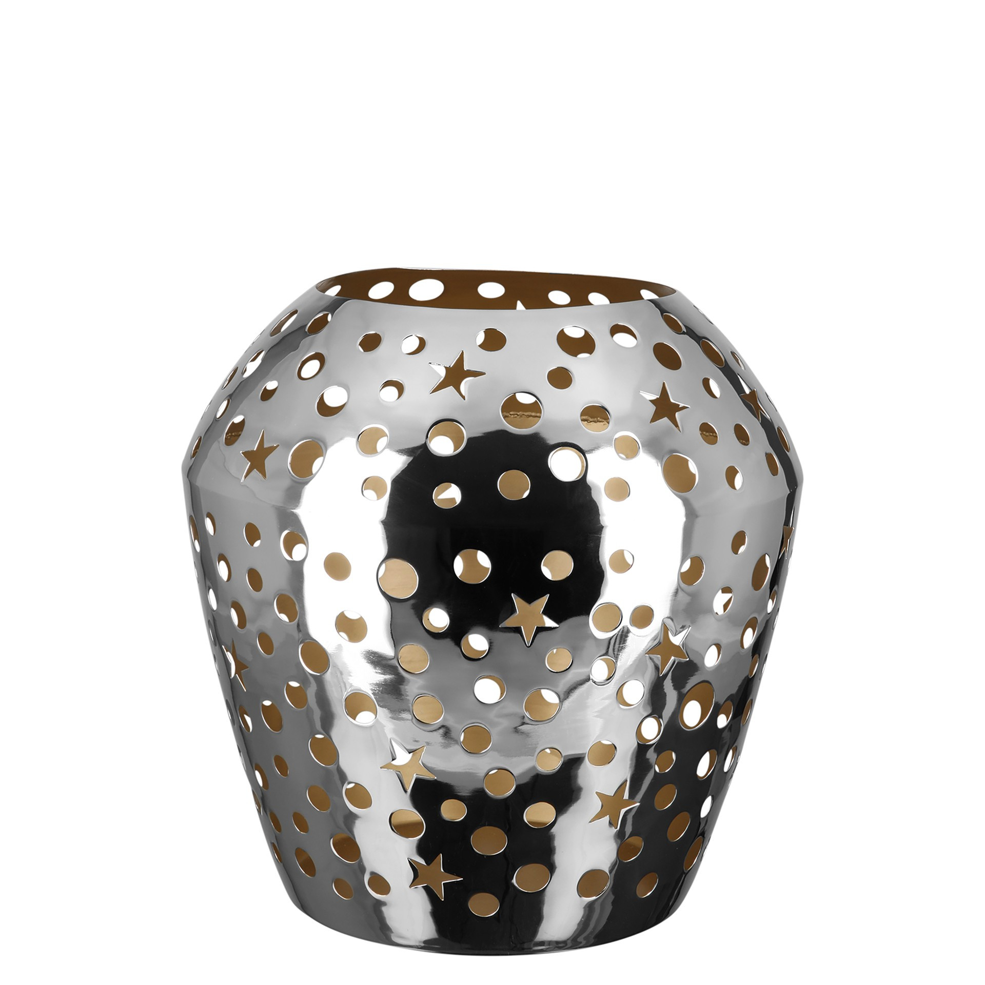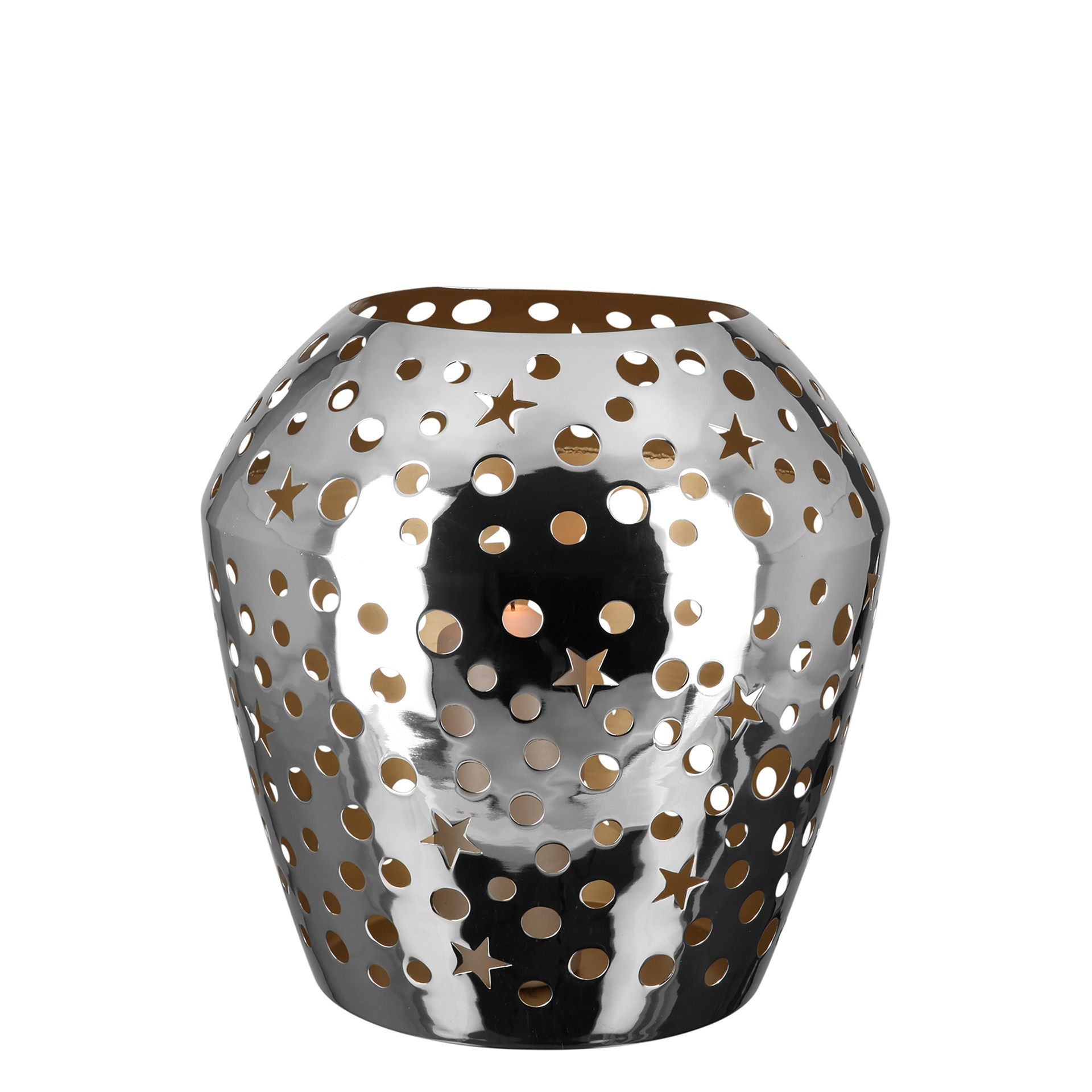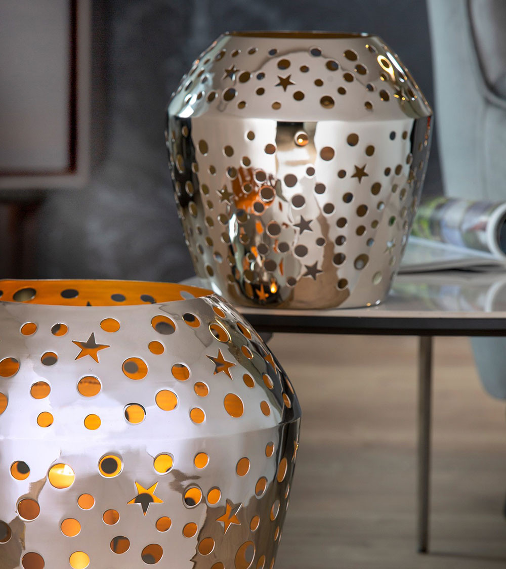 Lorsqu'il fait froid et orageux à l'extérieur pendant la saison, une décoration d'ambiance à la bougie est toujours la bienvenue dans votre maison. Le photophore SHEILA impressionne par son élégante brillance, de couleur argentée. Le revêtement intérieur en poudre de couleur dorée, associé à la lueur chaude des bougies, confère une atmosphère chaleureuse à toute pièce. Avec ses découpes circulaires et en forme d'étoile, le photophore crée des effets lumineux fascinants et convient également aux décorations de Noël et de l'Avent. Le photophore est disponible en deux tailles différentes et vous invite à les combiner. Chaque pièce est élaborée à la main de manière traditionnelle, créant ainsi des pièces uniques qui ont leur propre histoire de fabrication.